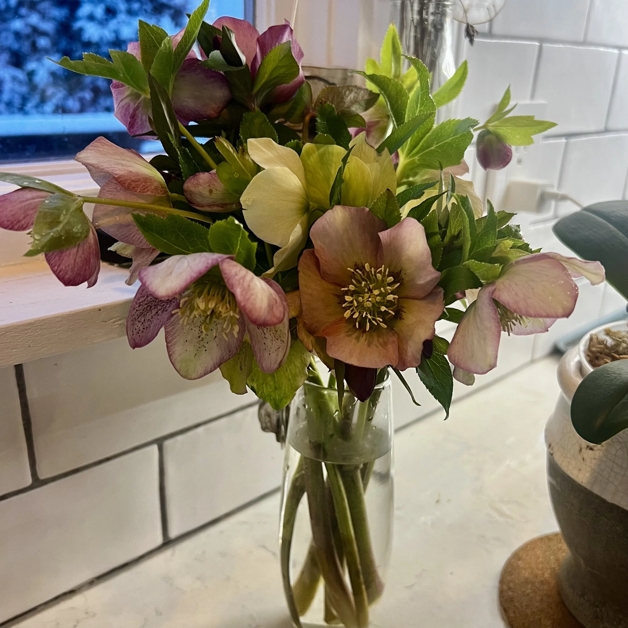 The photos were taken 10 days apart. The Hellebores were cut on February 18, and the second photo was taken on February 28. The flowers looked best in the first week but stayed nice afterward. During this time, they also developed seed pods and buds will open.